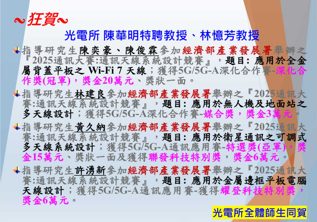 狂賀~ 光電所 陳華明特聘教授、林憶芳教授 指導研究生榮獲經濟部產業發展屬舉辦之「2025通訊大賽 : 通訊天線系統設計競賽」獲得冠、亞軍 2025 年 10 月 22 日 2025 年 11 月 20 日